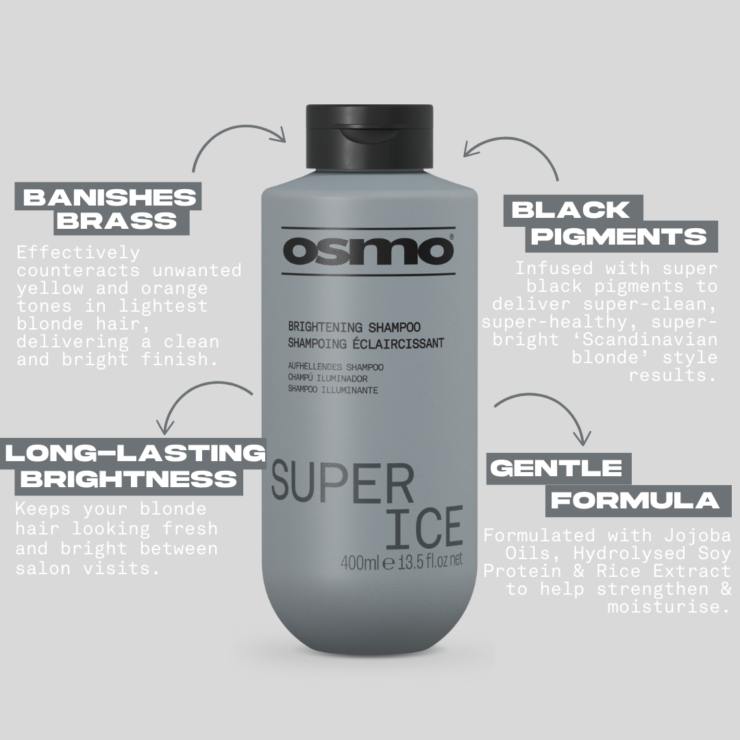 OSMO „Super Ice Brightening Shampoo“ švelnios formulės šampūnas, praturtintas hidrolizuotu sojų baltymu, simondsijų aliejumi ir ryžių ekstraktu, švelniai pašalina nešvarumus nuo plaukų ir galvos odos.